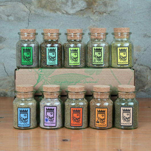 Mehr geht nicht! Mit der Kräutersalz Box bekommst du alle 10 Kräutersalze aus unserer KräuterGott Manufaktur